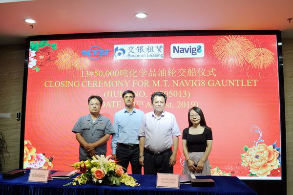 On August 30, 2019, the closing ceremony for 13# 50,000 DWT Product Oil/Chemical Tanker was held at the meeting room on 8th floor of New Times Office Building. Our Executive General Manger Mr. Zhang Yuyong, the Supervisor Chief Engineer Mr.Liang Miao from BoComm and site manager of Navig8 Mr.Kumar attended this ceremony. The vessel was smoothly and successfully delivered by us and accepted by the Buyer.