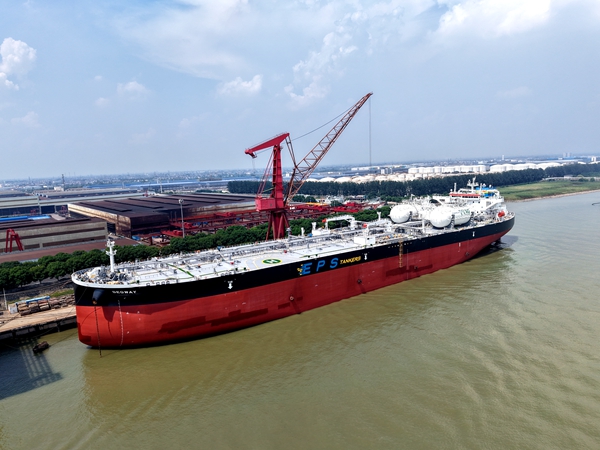 On August 25, 2025, the closing ceremony for 13# 155,500 DWT LNG Dual Fuel Crude Oil Tanker bearing Hull No.0315813 was held at the meeting room on 8th floor of New Times Office Building. The company's Chief Executive Officer Mr. Liu Haijin, Executive Deputy General Manager Mr. Zhang Yuyong and the owner's representatives Mr. Dino Vilicic and Mr. Ni Jie were present. The vessel was smoothly and successfully delivered by us and accepted by the Owner EPS.