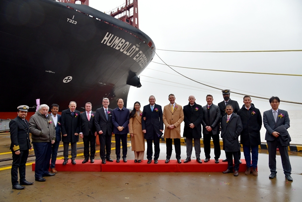 On March 4, 2024, we held naming ceremony for one 13000 TEU Container Vessel with Builder's Hull No.0213003. Our CEO Mr. Liu Haijin, Executive Deputy General Manager Mr. Zhang Yuyong, Hapag-Lloyd Hamburg - Managing Director Fleet Mr. Richard von Berlepsch, Hapag-Lloyd Hamburg - Senior Director Mr. Lutz-Michael Dyck, Anglo-Eastern Univan Group - CEO Mr. Bjorn Hojgaard, Anglo Eastern Technical Services Ltd. - MD Mr. Arunava Sengupta, Chartworld Shipping Corporation - New Building Manager Mr. Spyros Papandreou, BV Senior Vice President, Chief Executive; Marine & Offshore North Asia and China Mr. Alex Gregg-Smith, BV New Construction Dept. Manager in China - Mr. Christophe Vaes and other VIP guests attended this ceremony. Godmother Mrs. Brenda Hojgaard named the vessel for "HUMBOLDT EXPRESS".