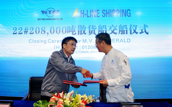 On October 30, 2020, the closing ceremony for 22# 208,000 DWT Bulk Carrier was held at the meeting room on 8th floor of New Times Office Building. Our CEO Mr.Liu Haijin, Executive General Manger Mr. Zhang Yuyong and the representive from H-Line Shipping Co., Ltd. attended this ceremony. The vessel was smoothly and successfully delivered by us and accepted by H-Line.