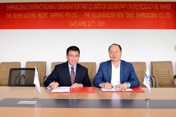 NEW TIMES SHIPBUILDING CO., LTD. has entered into two Shipbuilding Contracts with Singapore shipowner EPS (Eastern Pacific Shipping Pte. Ltd.) for building two(2)110,000DWT Crude/Product Oil Tankers recently.