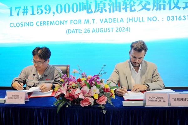 On August 26, 2024, the closing ceremony for 17# 159,000 DWT Crude Oil Tanker bearing builder's hull no. 0316317 was held at the meeting room on 8th floor of New Times Office Building. Our Executive General Manager Mr. Zhang Yuyong, Deputy General Manager & Executive Director Mr. Yuan Heng and owner's representative Mr. Evangelos Pelekanos were present. The vessel was smoothly and successfully delivered by us and accepted by the Owner.