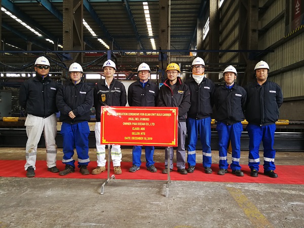 On December 18, 2019, the block fabrication of No.3 63,500 DWT Bulk Carrier was carried out at the cutting workshop of eastern area of NTS. Our Deputy General Manager Mr. Zhu Hangang and representatives from the owner Pan Ocean Co., Ltd. and ABS classification society attended this event.