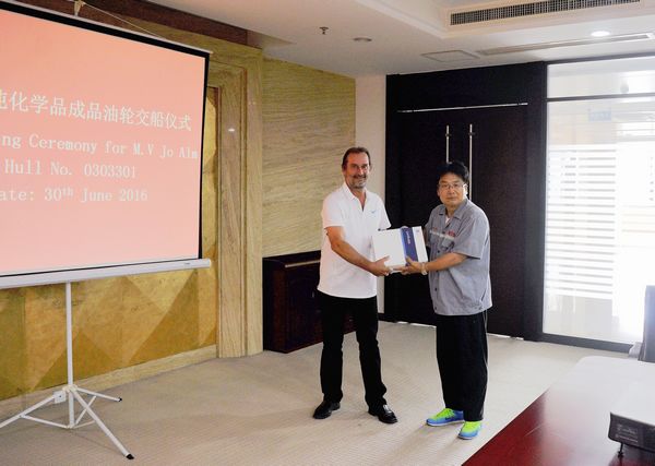 On the afternoon of June 30, 2016, the delivery ceremony for the first 33,000 DWT Product Oil and Chemical Tanker was held at the meeting room on 8th floor of New Times Office Building. The delivery documents for this ship were successfully signed by Executive Deputy General Manger Mr. Zhang Yuyong and representatives from the Contracted Buyer, Jo Invest AS.