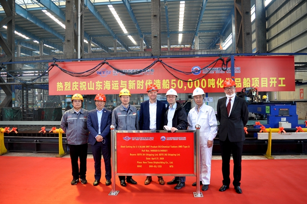 On April 27, 2020, the Steel Cutting Ceremony of No.20 & 21 50,000 DWT Product Oil/Chemical Tankers was carried out successfully by New Times Shipbuilding Co., Ltd. Our CEO Mr. Liu Haijin, Executive General Manger Mr. Zhang Yuyong, representatives from the owner Shandong Shipping Corporation and representatives from the classification societies DNV-GL and CCS attended and witnessed the ceremony together.