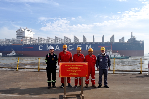 On December 9, 2023, the launching ceremony of one 7,000 TEU Container Vessel bearing builder's hull no.0207003 has been carried out successfully by New Times Shipbuilding Co., Ltd. Our Chairman Mr. Yuan Kaifei, Vice President Mr. Zhu Bingkang, Executive Deputy General Manager Mr. Zhang Yuyong, the representatives from EPS site team and ABS classification society attended and witnessed the ceremony together.