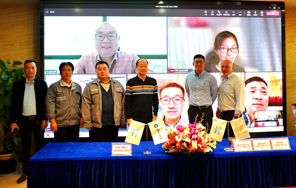 On October 18, 2022, e-closing for 34# 156,500 DWT Crude Oil Tanker was held at the meeting room on 8th floor of New Times Office Building. Our CEO Mr. Liu Haijin and Deputy General Manager & Executive Director Mr. Yuan Heng were present. Mr. Zhang Yuyong Executive Deputy General Manager of New Times Shipbuilding Co., Ltd., and Singfar representatives were present and the representative of CCB Financial Leasing Company Ms. Niu Wenjue signed the delivery documents via video and email. The vessel was smoothly and successfully delivered by us and accepted by the Buyer.