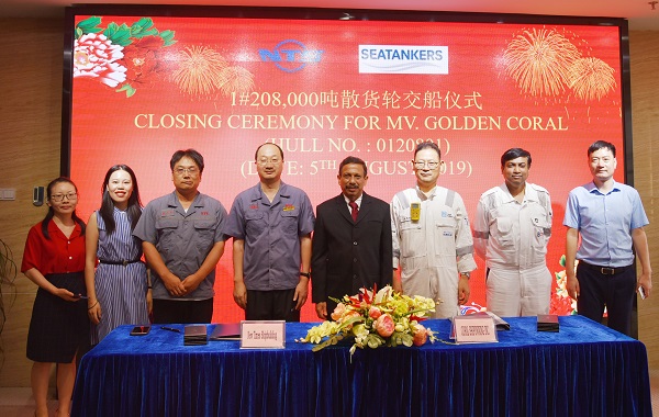 On August 5, 2019, the closing ceremony for 1# 208,000 DWT Bulk Carrier was held at the meeting room on 8th floor of New Times Office Building. Our CEO Mr.Liu Haijin, Executive General Manger Mr. Zhang Yuyong and the representative from Frontline Mr.A.C. Caeiro, representative from LR Mr.Kim attended this ceremony. The vessel was smoothly and successfully delivered by us and accepted by the Buyer.