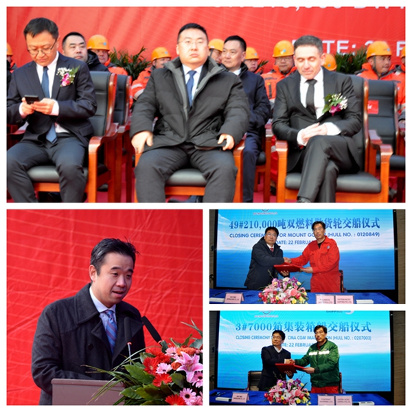 At 7:28 a.m. on February 22, the closing ceremony for 3# 7000 TEU Container Vessel with Builder's Hull No.0207003 was held at the meeting room on 8th floor of New Times Office Building. Our CEO Mr. Liu Haijin, Executive Deputy General Manager Mr. Zhang Yuyong, Deputy General Manager & Executive Director Mr. Yuan Heng and owner's representative were present. The vessel was smoothly and successfully delivered by us and accepted by the Owner Eastern Pacific Shipping Pte. Ltd.