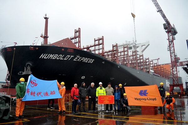 On December 10, 2023, the launching ceremony of one 13,000 TEU Container Vessel bearing builder's hull no.0213003 has been carried out successfully by New Times Shipbuilding Co., Ltd. Our Chairman Mr. Yuan Kaifei, Vice President Mr. Zhu Bingkang, CEO Mr. Liu Haijin, Executive Deputy General Manager Mr. Zhang Yuyong, the representatives from Hapag-Lloyd and BV Classification Society attended and witnessed this event.
