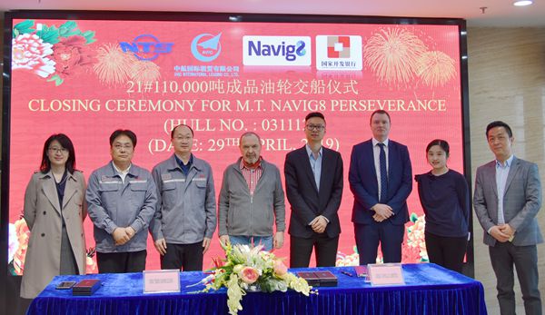 On April 29, 2019, the closing ceremony for 21# 110,000 DWT Product Oil Tanker was held at the meeting room on 8th floor of New Times Office Building. Our CEO Mr. Liu Haijin, Executive General Manger Mr. Zhang Yuyong and the representatives from AVIC, Navig8 and China Development Bank attended this ceremony. The vessel was smoothly and successfully delivered by us and accepted by the Buyer.