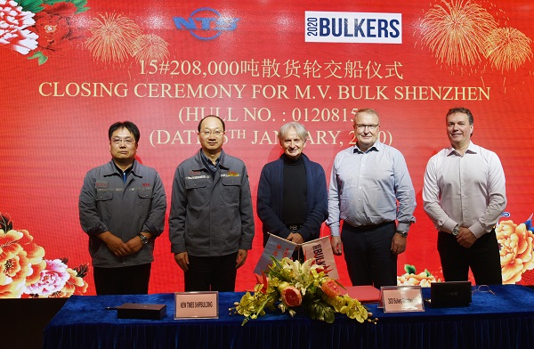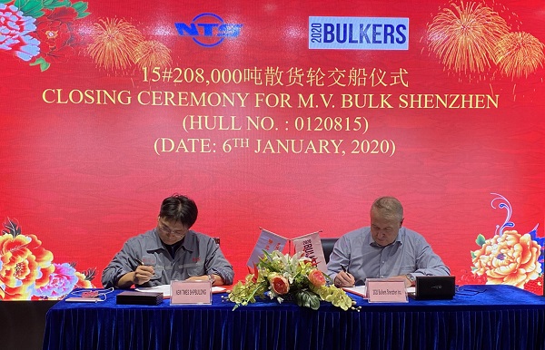 On January 6, 2020, the closing ceremony for 15# 208,000 DWT Bulk Carrier was held at the meeting room on 8th floor of New Times Office Building. Our CEO Mr. Liu Haijin, Executive General Manger Mr. Zhang Yuyong and the representative from 2020 Bulkers Ltd. attended this ceremony. The vessel was smoothly and successfully delivered by us and accepted by the Buyer.