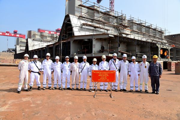 在鞭炮齊鳴中,33#34#210000噸雙燃料動力散貨船船體結(jié)構(gòu)開始合攏搭載。該型210000噸雙燃料動力散貨船總長299.95米,兩柱間長294.75米、型寬50.00米,型深25.20米,設(shè)計吃水18.40米,結(jié)構(gòu)吃水18.48米,載重噸210000MT。