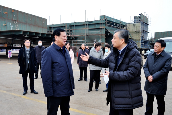 1月6日下午,省政協(xié)副主席閻立帶領省工信廳、省船舶工業(yè)行業(yè)協(xié)會、江蘇科技大學等相關領導、專家來到公司就高技術船舶產業(yè)鏈情況展開調研。公司董事長袁凱飛、副董事長朱炳康、黨委書記周燦榮陪同,泰州市副市長張育林、泰州市政協(xié)副主席陸曉聲,靖江市委副書記、市長陳鋒劍,市政協(xié)主席范敏,副市長王瑾參加調研。