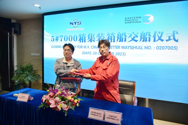 10月20日上午,公司在八樓會(huì)議室舉行船舶簽字交付儀式,常務(wù)副總經(jīng)理張玉永、副總經(jīng)理袁衡與船東EPS公司代表倪杰出席活動(dòng)。張玉永與倪杰代表雙方在交船文本上簽字,5#7000箱集裝箱船正式交付船東運(yùn)營(yíng)。