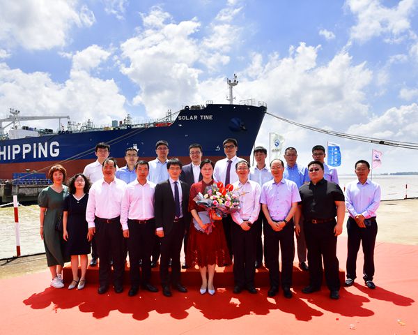 上午9:58分,常務(wù)副總經(jīng)理張玉永與山東海運副總理徐濤及工銀租賃代表等一起共同簽署了交船文本;簽字結(jié)束后,總經(jīng)理劉海金與山東海運副總經(jīng)理徐濤、圣母陳佳兒等嘉賓一起來到西區(qū)船舶碼頭,參加船舶命名儀式。在圣母的祝福祈愿聲中,23#50000噸化學(xué)品油船被命名為“SOLAR TINE”號。儀式結(jié)束后,總經(jīng)理劉海金又與參加活動的嘉賓們一起參觀了新船。