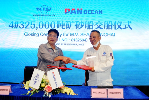 在大家見證下,常務(wù)副總經(jīng)理張玉永與韓國(guó)船東泛洋海運(yùn)公司代表共同簽署交船文本,4#325000噸超大型礦砂船正式交付船東。
