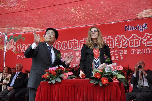 4月13日上午,公司隆重舉行船舶命名儀式,總經(jīng)理劉海金、英國船東代表Nicolas      Busch先生出席儀式,常務(wù)副總經(jīng)理張玉永主持儀式,公司領(lǐng)導(dǎo)朱韓鋼、丁柏英、鄭忠、徐震宇與Nicolas  Busch先生的家人及船級社代表等嘉賓一起參加了活動。13#111000噸油船被成功命名為“VAVIG8  PRIDE  LHJ”號。
