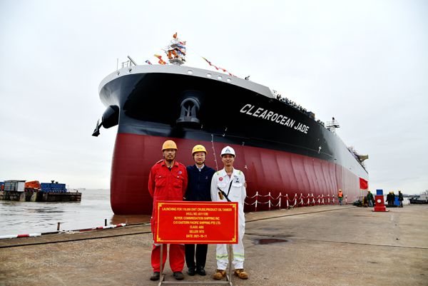 公司總經(jīng)理劉海金與船東新加坡EPS公司代表倪杰、ABS船級(jí)社代表等嘉賓一起在現(xiàn)場(chǎng)見證船舶下水。28#110000噸油船是船東新加坡EPS公司訂制的4艘110000噸油輪系列船中的第四艘船舶。